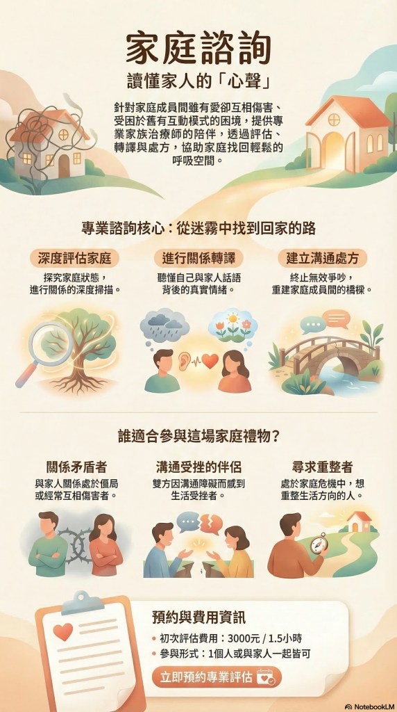 家庭應該是避風港,但有時也是壓力源。如果您正深受家庭關係矛盾、溝通受挫所苦,讓專業諮詢協助,試著幫您從迷霧中找到方向。