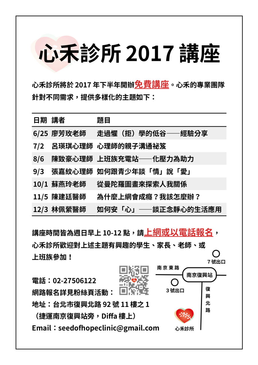 公告心禾診所公益講座 心禾診所要在今年下半年開辦免費講座!往後我們在每場講座之前,都會有更詳細的介紹,很歡迎有興趣參與的大家持續關心,或是協助我們分享訊息。心禾團隊感謝大家! 分享此文: 按一下即可分享至 X(在新視窗中開啟) X 按一下以分享至 Facebook(在新視窗中開啟) Facebook 喜歡 正在載入... 相關
