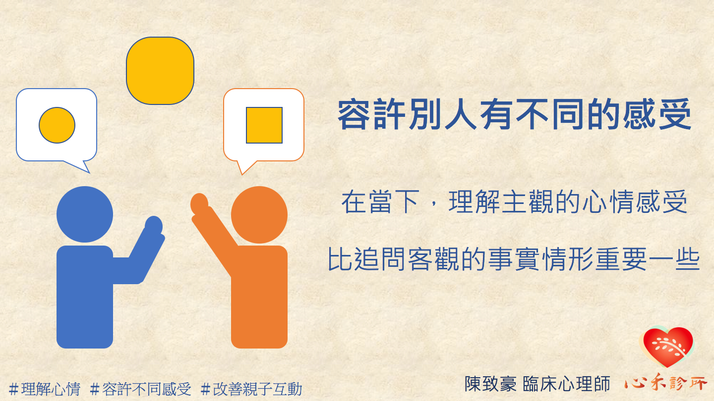 事實上,很多時候不同人描述的事情經過會有所不同,反而容易爭論不休。在感受上則沒有誰對誰錯,而是心情反應和心理狀態的不同。即使當下仍難理解孩子的反應和感受,可以只單純問他:「那這讓你覺得……?」並且嘗試「容許」他的感覺存在,尤其是被標記成「負向」的心情,包括傷心、生氣、難過等等。如同英文 “Agree to disagree" 所說的,同意別人有不同的看法或感受。假如對方回答「沒怎樣啦!」,也可以同意他「想說的時候再說」,不用急著追問「事情」;因為在此情境中,理解對方主觀的「心情」相對地比客觀的「事實」重要一些。試著多這樣做,親子間的互動一定會開始變得不同!