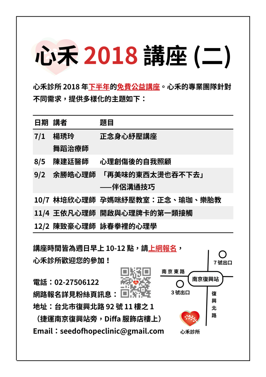 公告心禾診所2018年公益講座(二) 心禾診所2018年的公益講座深受好評。我們依據開辦這一年來的種種經驗,規劃了下半年更豐富的各種主題。心禾診所一樣會在每場講座之前,提供更詳細的課程介紹與報名資訊。歡迎心禾的朋友們持續參與,並協助我們分享課程訊息。謝謝大家! 分享此文: 按一下即可分享至 X(在新視窗中開啟) X 按一下以分享至 Facebook(在新視窗中開啟) Facebook 喜歡 正在載入... 相關