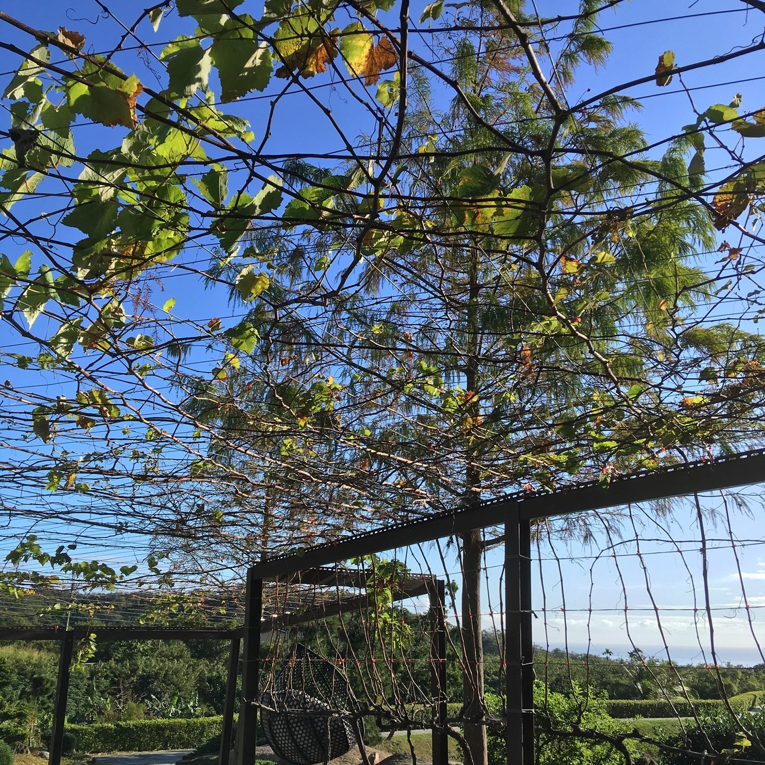 前陣子到醫院出遊時,看到尚未結果的葡萄樹。已經有好多年我沒有看到葡萄樹本身,而非採收之後的葡萄。我站在樹下仔細觀察它們如何透過支架的支撐往上,最後長滿整個藤架,葉子在陽光下閃耀。